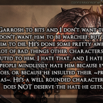 “I love Garrosh to bits and I don’t want to see him die. I don’t want him to be warchief, but I don’t want him to die. He’s done some pretty awful stuff, but a lot of bad things other characters did get attributed to him. I hate that, and I hate how so many people mindlessly hate him because everyone else does, or because he insulted their ~precious Sylvanas~. He’s a well rounded character and he does NOT deserve the hate he gets.”