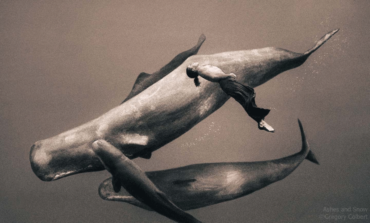 The orangutans signaled to a pod of whales who soon gathered round the ship. Enraptured, the whales silenced their blows and listened. They lined up end to end on the water’s surface and invited the elephants to cross.